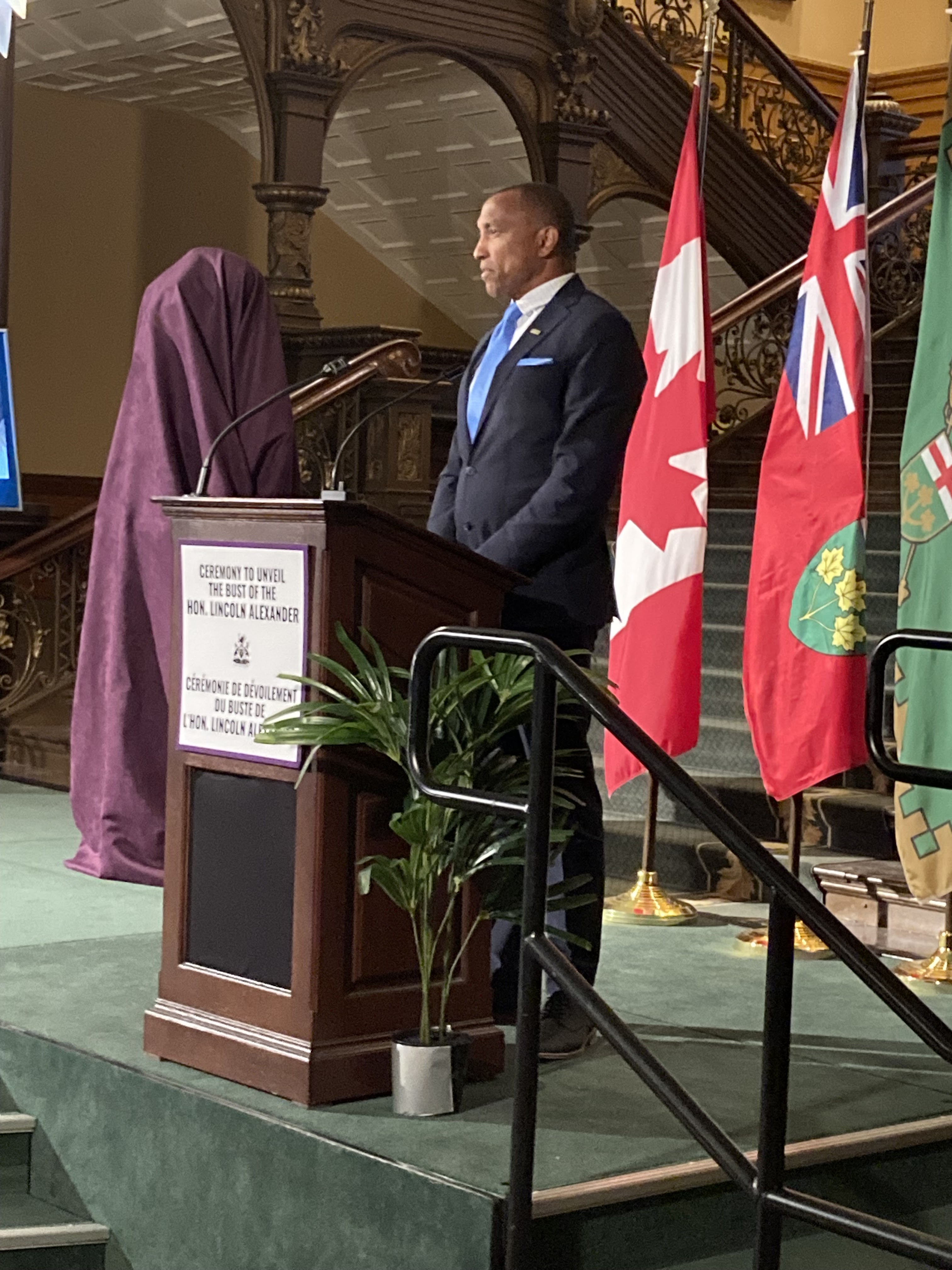 On January 21, 2024, on what would have been the 102nd birthday of Lincoln Alexander — and known nationally as Lincoln Alexander Day, since 2015, and celebrated in Ontario from 2013 — an unveiling ceremony was held at Queen’s Park to reveal the commemorative bust to Ontarians.
